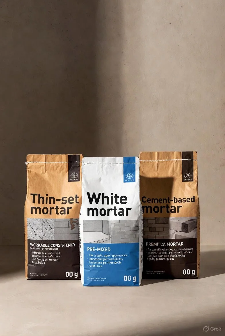 White mortar: Pre-mixed varieties are favored for achieving a light, aged appearance; these typically include lime for enhanced permeability and are documented in modern adaptations of traditional techniques.