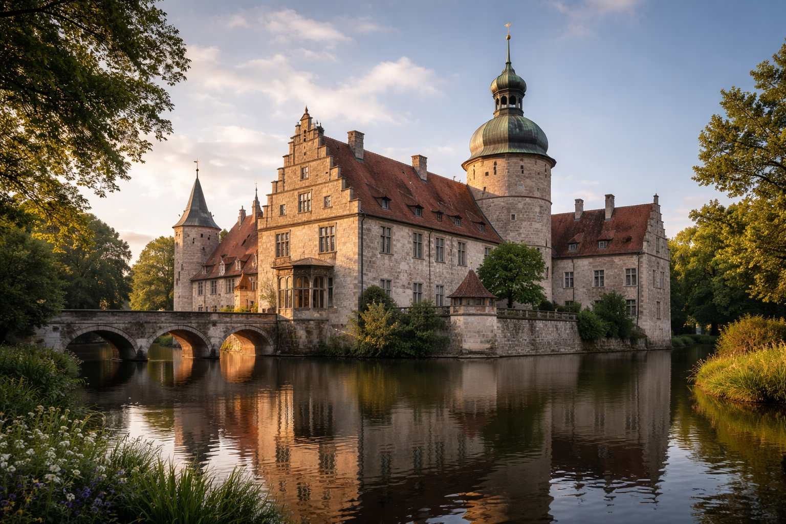 First documented in 1129, it evolved as a defensive water castle with multiple expansions and reconstructions.
