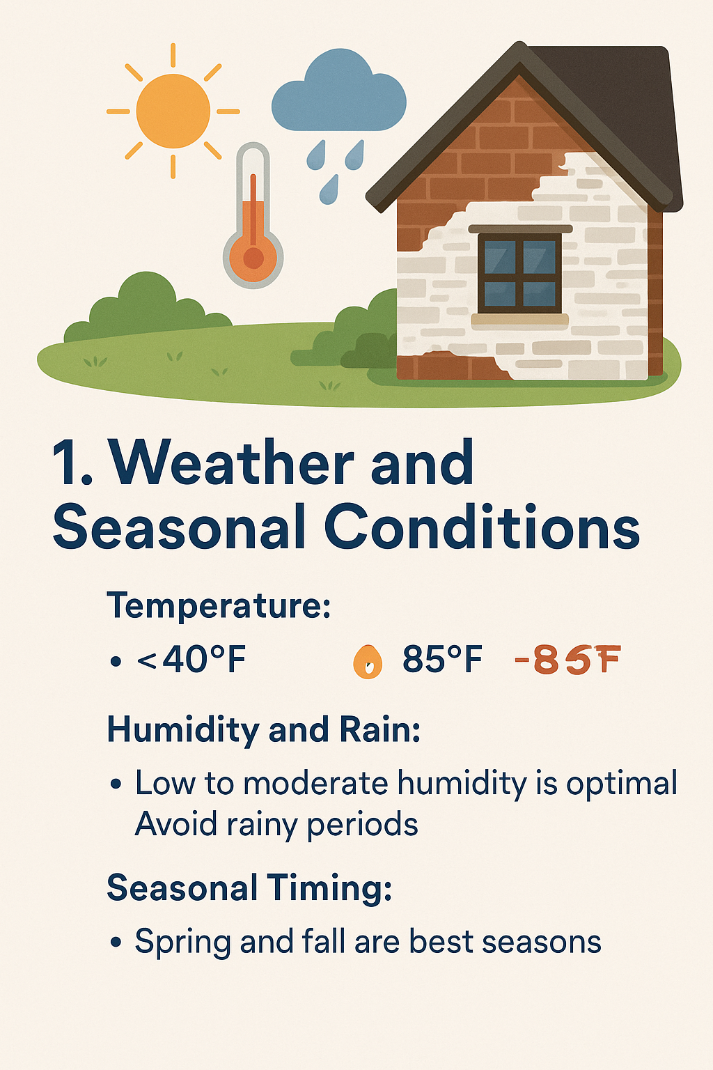 Humidity and Rain: Low to moderate humidity is optimal. High humidity can slow the curing process, while rain can wash away the mortar before it sets. Avoid scheduling during rainy seasons or periods of frequent storms. A dry forecast for at least 48–72 hours post-application is critical.
